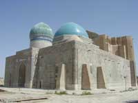 Je poursuis par le mausolée de Khodja Ahmed Lassavi (poète et maître soufi) édifié en 1397 avec le financement de Tamerlan. L'architecture avec ce gigantesque dôme bleu, est impressionnante et le monument imposant. Les murs extérieurs de côté et de derrière, sont entièrement recouvert de carreaux de céramiques vert et bleu. Il y aussi un énorme réceptacle en bronze à l'intérieur. Les abords, ainsi que le mausolée sont en rénovation à grand frais avec des fonds turcs. Après cette matinée culturelle, je prends un peu de temps pour envoyer quelques photos par Internet et pour répondre à mon courrier en retard. J'enchaîne sur une sieste avant de me rendre au bazard. Il est grand et animé. On y trouve des meubles décorés et des tissus au design local en quantité importante. Je me contenterais d'acheter juste deux petits chapeaux traditionnels. Après le dîner, j'irais avec le grand frère de Golem dans une grande fête pour étudiant. D'après ce que j'ai compris, c'est la journée internationale de reprise de l'école, donc un prétexte pour faire la fête. Il s'agit d'une grande discothèque installée sur le stade du coin. C'est comme chez nous, de la musique à la mode à fond, sauf que ce sont des tubes, à majorité, russes. C'est marrant à voir, mais je n'y resterais pas longtemps. Le vent souffle tard en soirée, la nuit est fraîche, c'est agréable. Encouragez-le, parlez-lui directement: solex@clamart.net