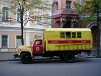 02aout 2000 Kiev (ter) Levé vers 8 heures. Je commence la journée par un marché à la foire fouille où l'on trouve tout et n'importe quoi surtout. Sa va de la robineterie aux insignes de l'ex empire soviétique en passant par des icones. Bien sur j'achète quelques trucs dont un clairon pour faire un peu de musique en passant les frontières. Je ne sais pas trop où je vais le mettre, mais il n'est pas lourd. Ce n'est pas le tout, j'ai encore des trucs à réparer et à préparer si je veux partir aujourd'hui pas trop tard vers l'est. Je commence par monter une paire de pneus neufs sur la remorque, ils s'adaptent super bien. Puis j'installe le moteur refait à neuf sur le cadre. Là, le résultat est moins bon. Le moteur tourne à peu près bien avec son nouveau bloc cylindre piston fraichement reçu de France, mais il y a un petit problème d'embrayage. Je ne vois pas trop, je piétine après un autre démontage complet. Un petit coup de fils d'assistance technique à Bertrand en France et l'affaire sera règlée. La journée est trop avancer pour que je sois assez motivé pour partir, et en plus il commence à pleuvoir un peu (alors qu'il n'y avait pas un nuage le matin). Je profite de l'après -midi pour décalaminer le moteur de rechange et faire l'installation des nouveau drapeaux sur la machine. Je rencontre quelques ukrainiens qui s'interressent à me voir bricoler ainsi qu'à mon périple. Je profite encore un peu de l'ambiance de Kiev, ainsi que du milieu français qui m'acceuil. Demain c'est sure, je reprend la route, mon Solex est complètement pret à repartir il n'y a plus qu'à charger la remorque. J'espère qu'il est pret à rouler longtemps sans trop de pannes, histoire que mes mains (et surtout mes ongles) retrouvent une couleur normale. Cette petite halte à Kiev était fort agréable, je pense que je reviendrais. Par contre, je n'ai pas pris le temps de répondre à mes mail, le courier en retard s'accumule. Je profite donc de cette page pas trop remplie pour remercier tous ces encouragements et toutes ces annecdotes sur vos expériences du Solex ou (et) du voyage all over the wide world. Moi aussi je prense à vous sur mon Solex. Je pense en particulier à ma nièce Clarisse qui est né il y a quelques jours et félicite grandement les parents. Encouragez-le, parlez-lui directement: solex@clamart.net