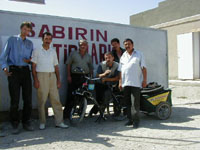 4 septembre 2000 - En brousse dans un décor de montagnes 42°N 57' 02" 72°e 28' 06" Je commence la journée par me rendre au bazar de Taraz avec les types qui tiennent le resto-parking pour poids lourds. Après plusieurs étales de diverses pièces mécaniques, nous trouverons les roulements adaptés à ma roue. J'en profite pour trouver aussi un peu de pâte magique pour colmater les fuites. De retour à la maison, je me mets tout de suite au travail. Je commence par la remorque, puis j'attaque mon ancien moteur. Je leur montre le pas de vis foiré, du coup il m'emmène dans un atelier de mécanique.