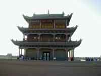 Nous arrivons vers 15 heures à l'entrée de la ville de Jiayuguan. La route coupe le mur de la grande muraille, puis nous nous rendons au fort. Il s'agit d'une passe qui date de l'époque de la route de la soie. L'édifice a été construit au quatorzième siècle et a ensuite été rénovée. A l'entrée, nous négocions un tarif étudiant. François montre sa carte d'électeur comme justificatif. Le fort est traversé par la route, filtrant ainsi le passage des marchants. On y trouve trois superbes tour à l'architecture typique chinoise. La visite est intéressante, nous y trouvons même quelques maigres explications en anglais. A la sortie du fort, nous reprenons nos Solex sous le regard étonné de quelques chinois et nous rendons six kilomètres plus loin sur une partie de la muraille de chine restaurée. Nous arrivons trop tard pour accéder au site, mais nous voyons la muraille grimper dans la montagne au soleil couchant. Il temps de rentrer en ville pour trouver un logement. La ville est très industrialisée, nous ne voyons que des cheminés et un truc qui ressemble à un réacteur nucléaire. Il n'y a pas trop de circulation, mais l'air est chargé en pollutions diverses. Le premier hôtel que nous choisissons n'accepte pas les étrangers, nous en trouverons un autre. Nous serons chacun dans une chambre à trois personnes avec deux autres touristes. Je suis avec un malais et un suisse qui voyagent ensemble. Le suisse d'une cinquantaine d'année, me raconte tous ces déboires avec les Chinois, il est virulent dans ces propos. Au restaurant, nous prenons du poulet. Pendant tout le repas nous cherchons de quel type de viande il s'agit. Nous en conclurons que ce sont juste des morceaux de gras de nature animal avec de la sauce. Heureusement le riz ressemble à ce dont nous avons l'habitude. Encouragez-le, parlez-lui directement: solex@clamart.net