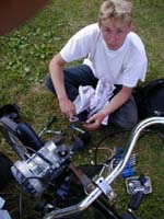 Vers 18h30, nous arrivons au camping de Rothenburg (ville médiévale fortifiée charmante), tout en bas d'une côte qu'il faudra remonter au réveil. A peine arrivée au camping, un couple de danois nous tombe dessus pour faire une superbe photo de nos montures. Ils connaissaient le VéloSolex, mais pas dans cette utilisation. Juste après la séance photo, nous démontons le moteur défectueux pour inspection, nous retravaillons l'attache de remorque, puis nous nous installons. Après bien des déboires, nous réussissons à faire fonctionner le réchaud multicombustible (il manquait une pièce tombée au fond du sac). 23h30, au lit. A demain. Encouragez-le, parlez-lui directement: solex@clamart.net