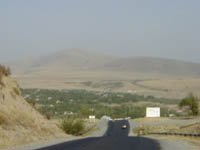 Je trouve un petit restauroute pour me désaltérer et me restaurer. La route continue à monter et descendre des collines dans une végétation un peu aride. Nous retrouvons les montagnes comme décor de fond. Cette fois, on peu apercevoir des sommets enneigés. Cela donne envie de faire du ski, mais le Solex ce n'est pas si mal non plus. A un poste de police, je tape la discute pendant dix minutes avec les miliciens. Au moment de partir, l'un d'eux s'enquière de savoir si j'ai un passeport, je veux le sortir, ce n'est pas la peine, il voulait juste savoir. Je trouve un petit emplacement pour ma tente face à ces majestueuses montagnes. Juste avant de s'installer, j'ai la roue arrière qui crève, je réparerais demain. En ce mercredi 6 septembre 2000, je n'oublie pas de souhaiter un joyeux anniversaire à l'un de mes frères et une bonne fête à un autre. Encouragez-le, parlez-lui directement: solex@clamart.net