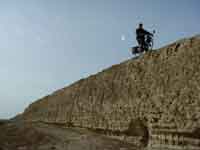 9 octobre Wuwei Réveil aux aurores au pied de la grande muraille. Avant de reprendre la route, nous montons un Solex sur la muraille même pour faire quelques photos. La route commence par une quarantaine de kilomètres de col. Nous en ferons une partie à pied. J'essaye de m'accrocher à camion pour moins me fatiguer mais cela fait mal au bras. Le chauffeur nous propose de nous emmener, bien sur nous refusons. Selon nos calculs, les maigres informations de la carte, la proximité de la neige, le climat, le fonctionnement des moteurs, le taux d'oxygène dans l'air, nous estimons que nous sommes montés à plus de 2500 mètres d'altitude.