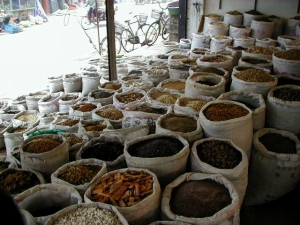 Je trouve un petit restaurant pour déjeuner. Le patron m'invite à sa table et essaye de faire parler anglais son fils de 13 ans. L'ambiance est fort sympathique, il refuse que je paye et m'invite pour le diner. Je prends un cyclo-pousse pour me rendre dans le coin de la gare ferroviaire. Là se trouve un immense marché médicinal. En parcourant les étales, on s'aperçoit de la diversité des produits et des odeurs.