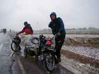 C'est en peu le déluge sous la neige, les chaînes ne sont pas nécessaires et les champs commencent juste à être blanc. La route est à peu près plate, mais le moteur de rechange est vraiment fatigué, il faut pédaler constamment. Dans l'effort il fait trop chaud, je retire des couches de mon équipement. L'eau projetée par le galet sur la roue créé un amas de glace autour des rayons. L'objectif de la journée n'est pas ambitieux, juste une quarantaine de kilomètres pour changer de ville. Puisque mon Solex n'avance vraiment pas vite (il n'y a que moi qui travaille, et je fatigue), nous arrivons de nuit à la petite ville de Huangyangzhen. Nous y trouvons un petit hôtel pas trop miteux et un restaurant du même type pour le repas du soir. Lorsque nous entrons dans la salle du resto, nous avons l'impression que les gérants sont transportés dans la quatrième dimension. Voir deux occidentaux débarquer dans ce rade en pleine nuit avec un tel temps, ça ne doit pas arriver tous les jours. La journée était bucolique mais intéressante, nous espérons un temps plus sec pour les prochains jours. Encouragez-le, parlez-lui directement: solex@clamart.net |