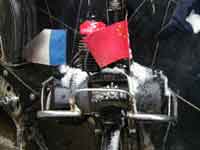 Nous ne pouvons pas passer à côté de l'occasion de faire du Solex sous la neige en Chine. Un petit changement moteur s'impose pour moi, mon galet est trop usé et patine avec l'eau. Je reprends mon moteur de rechange qui ne fonctionne pas très bien. Nous chargeons les Solex et allons manger un solide déjeuner avant de partir. Nous avons choisi au hasard une sorte de poulet bouilli. Nous avons un peu de mal à trouver la sortie de la ville, la route est en réfection. A la station service, nous profitons de l'occasion pour changer un pneu de remorque crevé. La pompiste se pose pas mal de questions et nous aide à nous équiper avant de repartir.