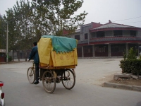10 Novembre Fuyang Réveil matinal pour un départ matinal. A 6h30, il y a un vent du diable et il pleut, je me recouche. Plus tard, le vent est toujours là mais la pluie a cessé, je mets les voiles. Le vent froid du nord me fait sortir de Bozhou. En fin de matinée, le Solex ralentit de plus en plus. J'observe des petites bulles au niveau de l'embase du cylindre. J'ai un boulon de faussé et je sais que j'ai des pertes de compression par-là. Le problème n'est pas uniquement cela, j'ai aussi la roue arrière qui frotte sur le garde-boue. Je redresse le tout, tant bien que mal et je reprends la route.