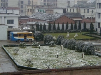 11 Novembre Huaibin Réveil matinal, j'entends les voiture rouler sur une route humide, mais je n'ai pas entendu pleuvoir cette nuit. Je pointe mon nez à la fenêtre, c'est normal, tout est blanc et il neige encore. Du coup, je me recouche. Plus tard, je me décide à me lever, le temps est plus clair et il tombe juste quelques flocons. Je me prépare et descends préparer mon chargement. J'utilise ma couverture de survie qui a déjà bien vécu pour étanchéifier le contenu de la remorque. Malgré le froid et la neige il y a une quinzaine de personnes pour me regarder partir. Le Solex à un mal fou à démarrer. Je le pousse sur environ un kilomètre en faisant des pauses.