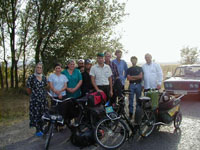 Encore un grand merci à tous les agents de l'ambassade pour leur accueil chaleureux. C'est la première fois de sa vie que François monte sur un Solex, et c'est au Kazakhstan que ça se passe. Nous n'avons même pas fait de test, juste la théorie, il apprendra la pratique en roulant. Il est un peu déstabilisé par les bagages sur l'arrière et le centre de gravité élevé de l'engin. Mais tout se passe bien, le baptême est une réussite. Boris en voiture nous aide à sortir de la ville parmi toutes les routes et la circulation dense, nous le suivons en Solex. Beaucoup de personnes nous observent et certaines nous encouragent. A peine sorti, nous faisons le plein d'essence et notre pose déjeuner. Un gars qui nous a vu à la télé hier, vient tchatcher avec nous et nous offre deux bouteilles d'eau minérale à notre départ. Puis, pendant notre pose syndicale du kilomètre cinquante, une voiture en sens inverse fait demi-tour et traverse le terre plein central à la sauvage pour venir nous voir. Les trois occupants du véhicule nous ont vu à la télé la veille. Ils font une série de photos de nous, puis nous donnent deux pommes et un faisan fraîchement chassé.