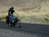 La route est en bon état, elle longe des cultures au début, puis vient la steppe. En fin de journée nous longerons un immense lac avec les sommets enneigés en toile de fond. Nous ne résistons pas à planter la tente face à ce spectacle. François vient de faire ces cent premiers kilomètres en Solex, il est ravi et épuisé. Nous cuisinons le faisan en émincé avec une sauce au cognac. Nous flambons le tout avant de servir. Le repas est délicieux pour la situation, le soleil se couche, la pleine lune se lève, la nuit est claire et tiède, il est l'heure de se coucher afin de récupérer un peu de nos quelques jours de repos à Almaty. Encouragez-le, parlez-lui directement: solex@clamart.net