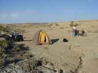 15 septembre 2000 - Chine - 70 kms 44°N 10' 28" 79°E 31' 59 Réveil en pleine nuit par la pluie. Nous nous levons rapidement pour mettre la bâche sur la remorque et planter les piquets de la tente. Ca ne dure pas, mais ça reprend à plusieurs reprises. En définitive, il fera beau au matin. La journée de route débutera par un petit col. Nous avons l'impression que ça ne monte pas énorme et que les Solex fatiguent. En fait, ça montait beaucoup et les Solex fatiguaient. Entre l'essence qui mousse, les pompes à essence qui ne font pas leur travail et le soleil et la chaleur, nous avons du mal à diagnostiquer les pannes. Nous nous arrêtons tout le temps un peu excédés par les moteurs qui s'arrêtent. Nous y ajouterons aussi deux petites crevaisons. La montée du col est dur, mais le spectacle valait franchement le coup. Les montagnes sont immenses et dénuées de végétation. Nous rencontrerons quelques admirateurs qui s'arrêtent pour nous serrer la main, notamment en pleine montée. De l'autre côté du col, la route déscend sur un plateau de steppe bordé de montagnes. La région est vraiment désertique, nous avons du mal à trouver du ravitaillement. De plus, notre progression est de la plus lente, nous ne faisons pas beaucoup de kilomètres. Nous bricolons en plein soleil, mais nous aurons la joie d'avoir une petite pluie à grosses gouttes en roulant. Le vent se lèvera aussi pour nous ralentir un peu. En fin de journée, nous attaquons la descente interminable du plateau. Nous ne pensions pas être montés si haut. Nous descendons sans le moteur pendant environ quinze kilomètres. Le paysage change encore, il y a des airs de canyons. La terre est ocre jaune, le coucher du soleil accentue ces couleurs et nous livrent ainsi un spectacle colossal.