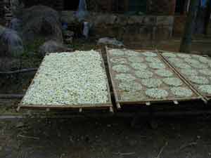 15 Novembre Jiujiang Réveil aux aurores pour une longue journée. Je commence par un peu de bricolage, j'essaye de démonter la "roue libre" de la roue arrière. Même avec quelques coups de marteau, je n'y arrive pas, elle est "indésolidarisable" de l'axe de la roue. Cependant, le fait de lui taper dessus, a agit vers un meilleur fonctionnement. Je remonte le tout et quitte la ville de Xishui. Le temps est couvert, il y a du brouillard et il pleut en discontinu de quoi laisser constamment la route mouillée. La route n'est pas en trop mauvais état, cependant elle passe toujours dans une zone montagneuse. J'arrive à enclencher le pédalier et à monter quelques côtes à la force de mes jambes, aidé par le moteur fatigué. Pas de panne, juste un changement de pneu de remorque, histoire de faire une longue pause.
