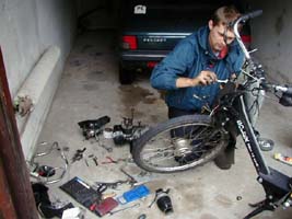 17 juillet 2000 - Cieszyn Une fois de plus le mauvais temps est là. Il a plu toute la nuit et encore toute la journée pour ne faire une halte que vers 22 heures. Lever matinal vers 8h30 avec petit déjeuner pour bien débuter la journée. La pluie ne nous enchante ni à bricoler ni à partir. Après de longues discussions philosophiques sur la vie de notre ville Clamart, nous commençons la dissection du Solex dans un garage que nous squattons avec plaisir.