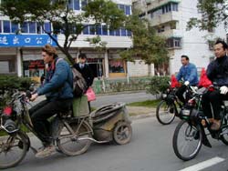 17 Novembre Nanchang Réveil aux aurores au bord d'un petit lac au pied des montagnes. Mon voisin, un vieux qui habite un chalet à 200 mètres, vient voir si je suis bien réveillé. Il était passé hier soir lors de l'extinction des feux. Et il repasse au moment de mon départ pour me souhaiter bon courage. La route traverse encore un splendide paysage de montagnes perdues dans la brume. Le soleil roule bien (en fait, ça descend plus que ça monte), comme l'on m'a dit, "le cheval sent l'écurie". D'ailleurs, mon drapeau français s'envole, mon reste de casque et deux pneus de remorque tombent sur la route sans que je m'en aperçoive. A une vingtaine de kilomètres de Nanchang, je retrouve Dominique Chaumont de la juventure Solex (Lowlite Engineering France) avec un journaliste de Nanchang TV et des personnes de l'usine. Je ne m'attendais pas à un accueil si tôt. Nous allons manger un brin avant de terminer la route. Les derniers kilomètres passent vite, les derniers morceaux de campagne laissent place à l'immense agglomération. C'est bien que je sois accompagné, cela me permet de ne pas chercher mon chemin.