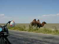 19 août 2000 - Non loin de F#~ù@bp 48°N 19' 35" 55°E 02' 02" Après avoir bataillé toute la nuit avec les moustiques, je me lève et quitte la ville de Makat. Je cherche la route, je demande, on me répond que j'y suis alors que je suis sur un chemin de terre. En fait, sur les dix premiers kilomètres, la route se résume à des pistes à travers la steppe. Je m'engage et sur une partie, je tombe sur une surface d'argile humide. J'en mets partout, je m'embourbe et puisque le Solex est à entraînement par galet, le moteur patine sans tracter. Le chemin se transforme ensuite en route goudronnée en mauvais état. Je comprends mieux pourquoi j'ai croisé aujourd'hui moins de quinze véhicules, c'est parce que la route est abominable pour circuler. Mais, de toute façon il n'y en a pas d'autre et ce n'est pas grave, je suis en Solex!! Les dépôts d'argile ont séché sur le Solex, mais ils ont cuit sur le galet qui continue à patiner. Je ne sais pas trop comment l'enlever sans abîmer le galet, tant que c'est plat ça va. Je réussis à crever deux fois. Comme par magie, un café restaurant pointera son nez juste au bon moment de la journée. Je tape la discute avec les clients qui me conseillent sur mon trajet. Un type me propose de m'emmener (mon Solex et moi) jusqu'à la prochaine grosse ville avec son camion. Il ne comprend pas pourquoi je refuse, moi je comprendrais plus tard !