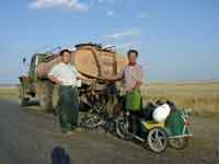 Le Solex se comporte normalement, il roule tout seul mais il faut l'aider quand ca monte Deux gars marrants s'arrêtent devant moi en camion pour me poser tout plein de questions sur mon périple. Je terminerais par les prendre en photo devant mon Solex, ils sont ravis. Les paysages sont toujours aussi surprenants et gigantesques. Déjà, la steppe est là. Puis viennent des collines aux formes bizarres. Bien sur ça monte, mais c'est beau. Nous atteignons alors un plateau ou la culture céréalière est pratiquée. Nous passons près d'une petite ville industrialisée avec des terrils géants. Je m'installe pour la nuit, non loin d'un champ, dans la brousse. Encouragez-le, parlez-lui directement: solex@clamart.net