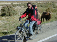 C'est comme dans un jeu vidéo où il faut éviter des obstacles et en écraser d'autres tout en évitant les véhicules qui circulent. Le paysage est toujours désertique mais le temps est frais. Il y a comme un voile sur le soleil sans que ce soit des nuages. Le vent souffle avec force. Au début, il nous pousse, tout va bien. Puis, brusquement, il tourne pour se retrouver face à nous. Notre vitesse se réduit, nous sommes obligés de pédaler sur le plat. Nous cherchons un emplacement pour la nuit, à l'abri du vent de préférence. Nous nous poserons derrière quelques buttes de graviers. Avant la nuit complète, nous procédons au décalaminage des deux Solex. Le montage de la tente par grand vent n'est pas de toute évidence, l'espace de vie à l'intérieur est réduit. Pour la cuisine, ça se fera dans la tente à l'abri du vent. Le vent souffle toujours, les Solex sont bien calés pour la nuit, la température se refroidi, nos duvets sont appréciables. Encouragez-le, parlez-lui directement: solex@clamart.net