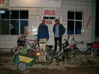 La route traverse toujours le désert de sable et de graviers. En fin de journée nous arriverons dans des montagnes basses de roches. De temps en temps, il y a des équipes de chinois qui creusent des tranchées à la pioche en bord de route pour poser des câbles. Une voiture qui transporte un chameau à l'arrière nous double. Le vent a tourné, mais les Solex ne fonctionnent plus comme ils le devraient. Il y une mauvaise carburation avec des fonctionnements aléatoires sur les deux machines. Nous n'arrivons pas à l'expliquer clairement. Nous soupçonnons fortement la mauvaise qualité de l'essence. Mais nous n'excluons pas la conjoncture de plusieurs facteurs tels que la température extérieure, la pression atmosphérique, le rayonnement ultraviolet, l'humeur, la couleur de l'asphalte, la position de la lune ou encore la radioactivité. C'est que le Solex est une bête sensible à toutes sortes de choses, et c'est surtout qu'il n'est pas très rationnel. Lors de la montée du col en poussant ma machine, je pense que ce serait mieux de poursuivre la route avec une tondeuse à gazon autotractée. Nous arrivons à Xingxingiang, ville frontière entre la province autonome du Xinjiang et la province du Gansu. Nous quittons donc le pays ouigoure, que nous regretterons peut-être. Nous nous arrêtons dans un petit restoroute à la vue d'un VTT surchargé. C'est celui de Adams qui vient du Pakistan en vélo. Il était avant au Tibet, à Katmandou et en Inde. Il est aussi américain et il va à Pékin. Nous discutons pendant le diner. A la tombée de la nuit, nous remontons sur nos montures respectives pour se rendre dans le désert et y passer la nuit. La soirée est agrémentée d'un peu de cognac et de chocolat. C'est fou le nombre de gens qui font des trucs bizarres à vélo que l'on peut rencontrer sur la route de la soie. Et tout ça le même jour et dans l'un des coins les plus désertiques. Encouragez-le, parlez-lui directement: solex@clamart.net