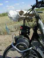 La route doit être en train d'être refaite, il y a quelques kilomètres de goudron liquéfié par le soleil. Ca permet de me freiner et de refaire la déco du Solex et surtout de la remorque. En plus, ça ne sèche pas, je m'en mets partout. Je n'arrive pas trop tard à la ville de Kzil Orda, une ancienne capitale du Kazakhstan au temps de la grande Russie. J'ai un peu de mal à trouver le centre ville au milieu de tous ces blocs d'immeubles. Je me demande s'il y a en a un. Je trouve un hôtel que je quitte rapidement pour aller faire un tour en ville. Le marché est intéressant et animé. Le reste ne retient pas particulièrement mon attention. J'espérais trouver le réseau GSM dans cette ville qui a tout de même un aéroport, mais non. J'ai essayé de trouver un business center avec Internet, mais non. C'est à croire que Internet n'existe pas... Encouragez-le, parlez-lui directement: solex@clamart.net
