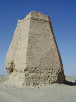 30 septembre 2000 Dunhuang Réveil matinal avec un vent frais mais un ciel bleu. Nous prenons la route un peu après Adams. Nous le retrouvons lors d'une pause melon. Nous croisons nos premiers fragments de la muraille de Chine, il n'en reste pas grand chose. Ce ne sont que des tas de terre cuite. Nous quittons Adams qui souhaite se balader un peu à pied dans le désert.